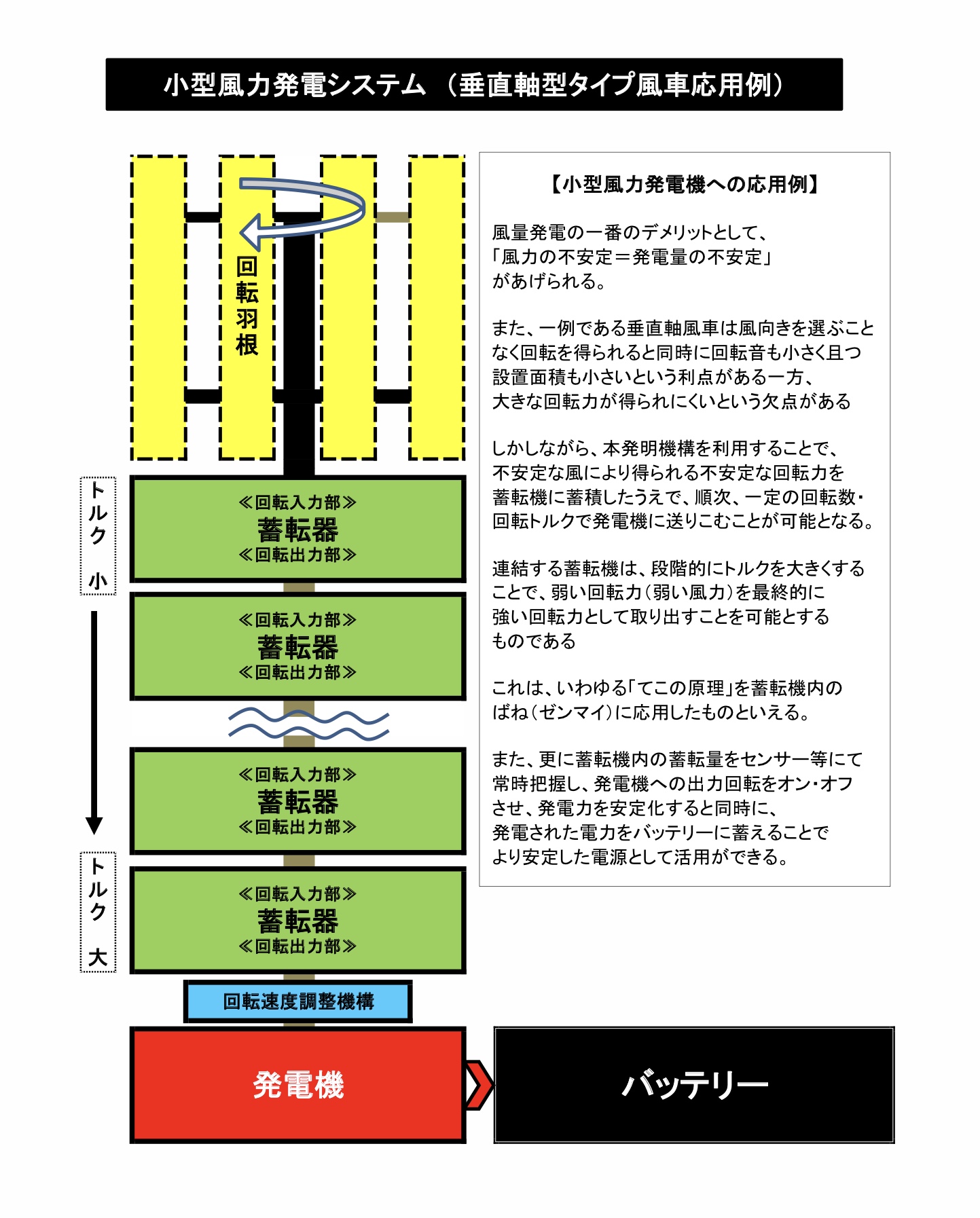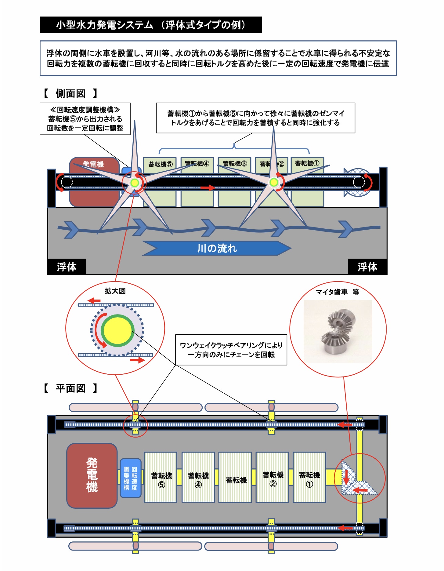 これらの川の水の流れをせきとめることなく複数の水車で得られる回転力を蓄転器で蓄積してから活用することで、単体の水車で得られる不安定な発電力ではなく、より大きく安定した発電力が得られます。