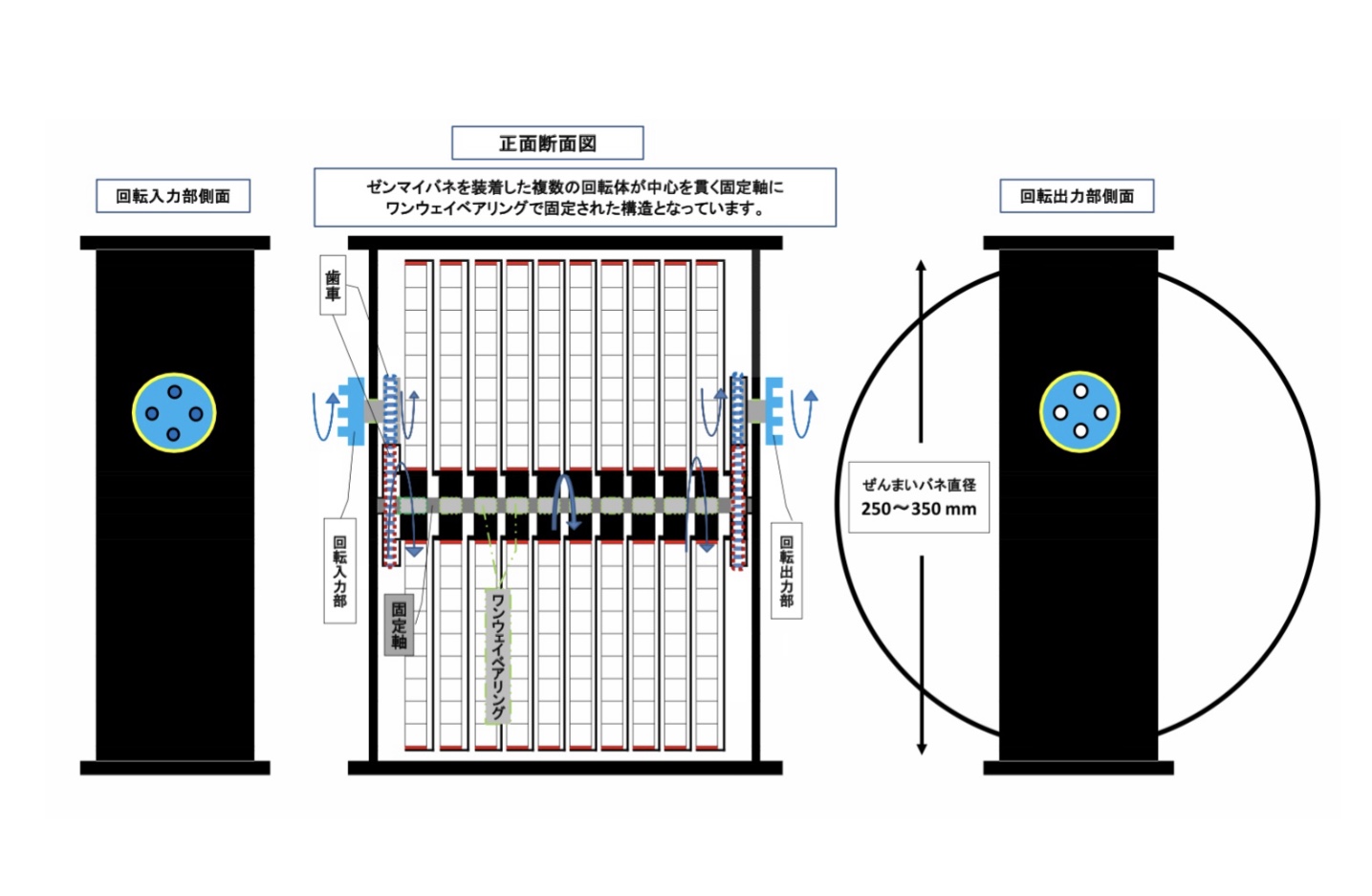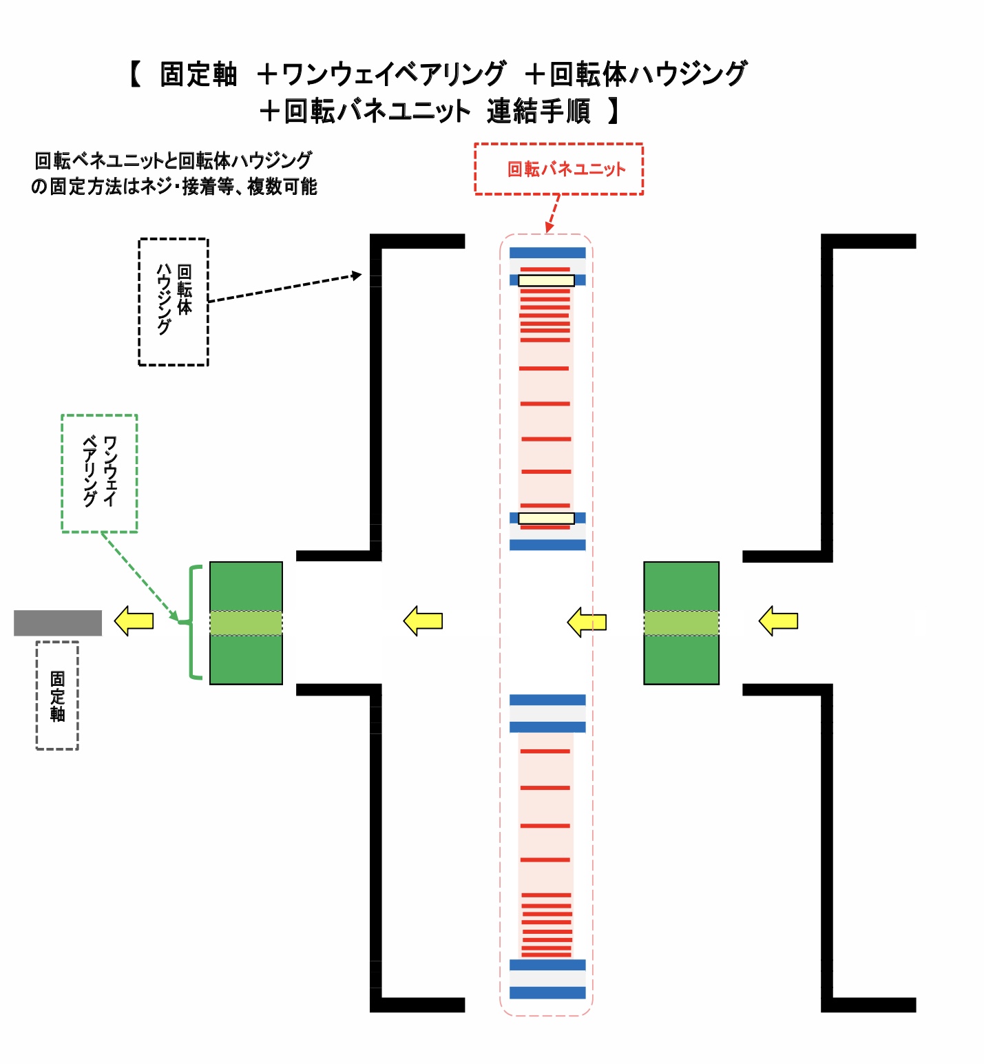 ゼンマイバネ(回転バネユニット)を収納する回転体ハウジングの内径側をワンウェイベアリングに固定したうえで一本の固定軸(丸棒)に差し込み、いずれの回転体ハウジングも固定軸の周りを同一方向だけに回転する様、装着する。