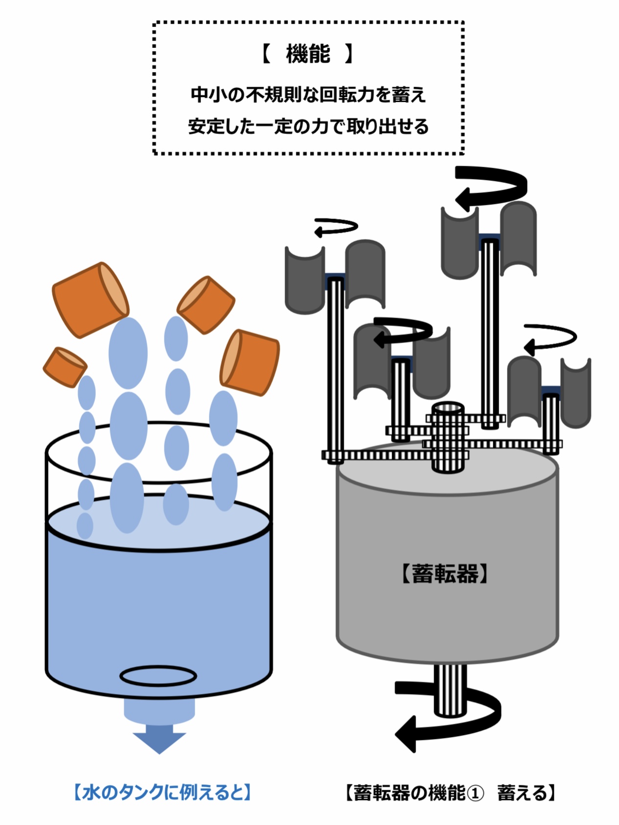 RSRS(蓄転機)の発想はこれと同じであり、一つの一つの小さな回転力をそのまま使うのではなく、小さな回転力を集めることで大きく安定した回転力を得ようとするものです。